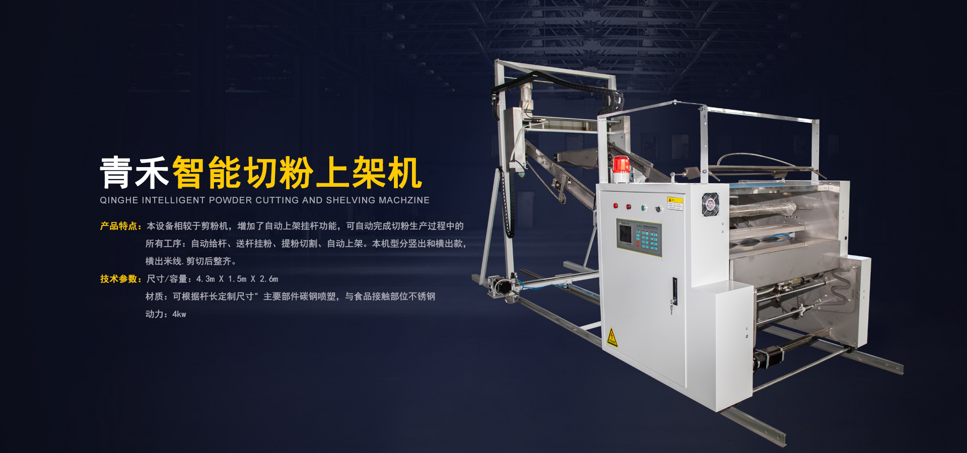 本设备相较于剪粉机,增加了自动上架挂杆功能,可自动完成切粉生产过程中的所有工序:自动给杆、送杆挂粉、提粉切割、自动上架。本机型分竖出和横出款,横出米线剪切后整齐。